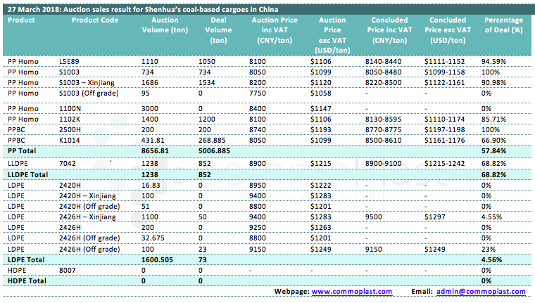 27 March 2018: Auction sales result for Shenhua's coal-based cargoes in China