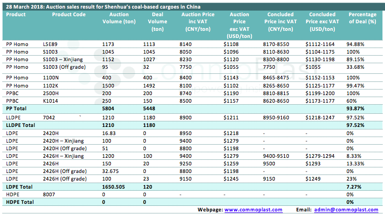 28 March 2018: Auction sales result for Shenhua's coal-based cargoes in China