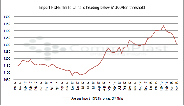 Import HDPE film to China has been slithered down the slope after hitting the peak on the second week of February 2018, however, took deeper dive in late March. On an average, import HDPE film to China fell about $125/ton, to be traded in the range $1270-1350/ton CFR China, LC 0-90 days term as of 28 March 2018, CommoPlast data showed.