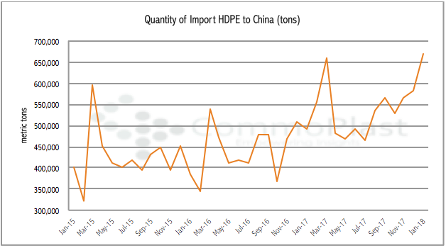 The continuous uptrend in import HDPE market since mid-2017 as a result of buyers searching replacements after the ban on plastic waste imports rocked recycle industry has attracted many overseas suppliers to divert cargoes to China. Import arrival to China in January hit multi-year high levels, surging 26.2% from October 2017 to 667,485 tons.