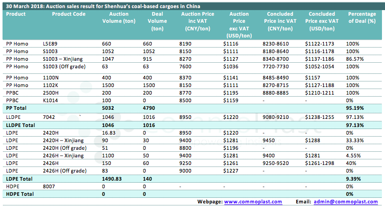 Auctions sales result for Shenhua’s coal-based polyolefin products in domestic China are as following:
