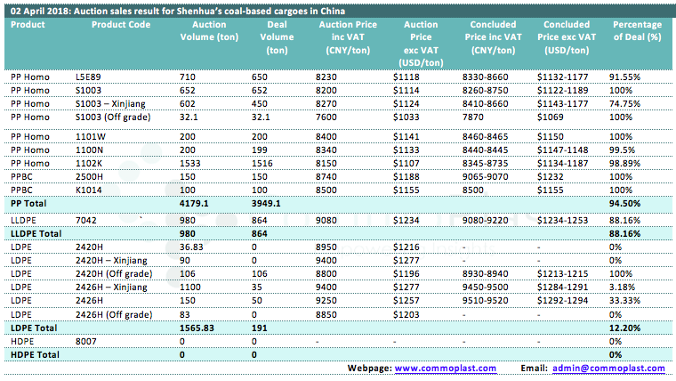 02 April 2018: Auction sales result for Shenhua's coal-based cargoes in China