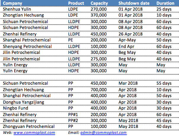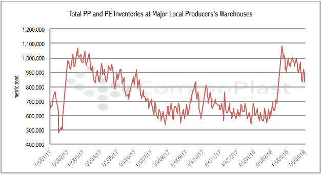 Private data combined by CommoPlast showed that the apparent inventory pressure on major local producers, including Sinopec and CNPC, has reduced evidently since early March 2018. Just before the market went off for the Tomb-sweeping holiday, total PP and PE inventories on major producers’ hands fell to approximate 830,000 tons. This is a result of an extensive effort in stimulating local demand while switching production to non-commodity grade for better margins. In fact, local homo-PP injection grade has been commanding a premium of CNY100-150/ton ($16-24/ton) for two weeks straight, which is relatively attractive to producers.