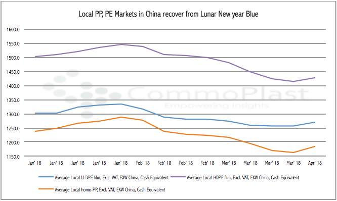 Private data combined by CommoPlast showed that the apparent inventory pressure on major local producers, including Sinopec and CNPC, has reduced evidently since early March 2018. Just before the market went off for the Tomb-sweeping holiday, total PP and PE inventories on major producers’ hands fell to approximate 830,000 tons. This is a result of an extensive effort in stimulating local demand while switching production to non-commodity grade for better margins. In fact, local homo-PP injection grade has been commanding a premium of CNY100-150/ton ($16-24/ton) for two weeks straight, which is relatively attractive to producers.