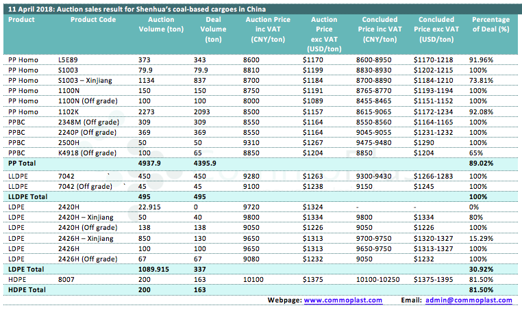 Auctions sales result for Shenhua’s coal-based polyolefin products in domestic China are as following: