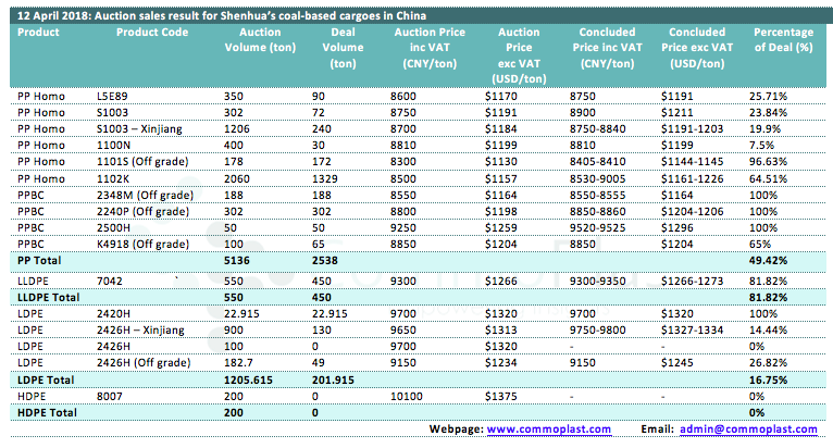 12 April 2018: Auction sales result for Shenhua's coal-based cargoes in China