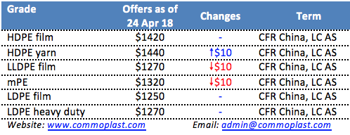 A major Thailand producer has announced weekly PE offers to China mostly at a stable to softer levels as the previous increases yielded disappointing sales results. The latest adjustment, however, remains unattractive to buyers, who are away for the ChinaPlas Exhibition.
