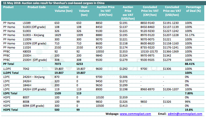 Auctions sales result for Shenhua’s coal-based polyolefin products in domestic China are as following:
