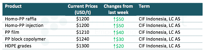According to market sources, a major Thailand producer has announced new offers for PP and HDPE to Indonesia this week with additional hike from the last offer. The producer’s latest price list is shown in the following table: