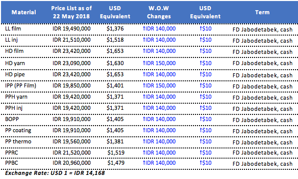 It is reported that a major domestic producer in Indonesia has announced new PP and PE price list for the second time this week with additional $10/ton increased on all grades. Weakening Indonesian Rupiah plays an important role in the latest hike, sources said.