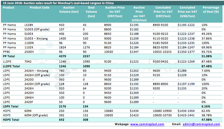 Auctions sales result for Shenhua’s coal-based polyolefin products in domestic China are as following: