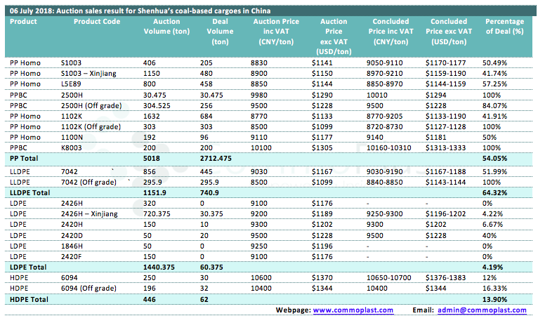 06 July 2018: Auction sales result for Shenhua's coal-based cargoes in China