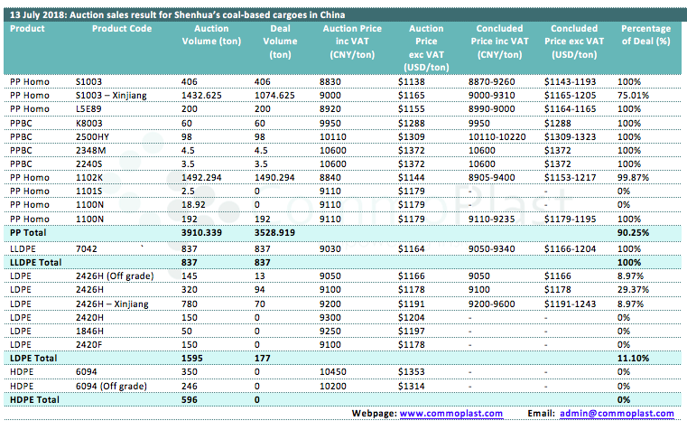 13 July 2018: Auction sales result for Shenhua's coal-based cargoes in China