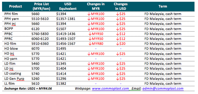 Malaysian buyers reported to have received fresh PP and PE offers for August 2018 delivery from a major local maker with MYR100/ton ($25/ton) decreased for homo-PP, BOPP, and LDPE, MYR50/ton ($12/ton) reduction for PP copolymer, MYR80-100/ton ($20-25/ton) decreased for HDPE, meanwhile HDPE offers remain stable as compared to last month.