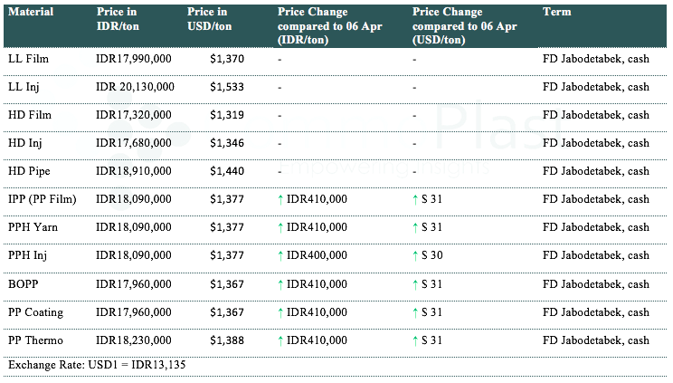 According to market players, a major local Indonesia producer has adjusted their PP offers today with IDR400000-410000/t ($30-31/t) increased from last week.