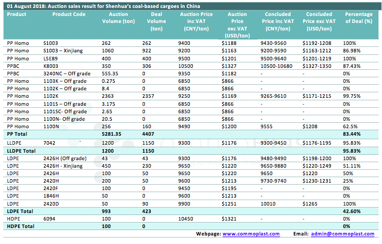 Auctions sales result for Shenhua’s coal-based polyolefin products in domestic China are as following: