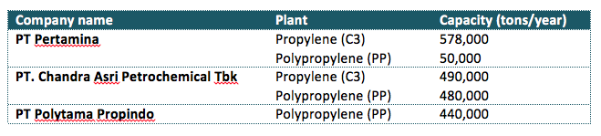 PT Pertamina owns a polypropylene (PP) plant with annual capacity of about 50,000 tons/year. The company has newly commissioned its 150,000 tons/year RFCC cracker in Cilacap, Central Java in Oct 2015, which boosted total propylene (C3) capacity of the company to 578,000 tons/year.
