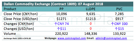 Contract number 1809 on Dalian Commodity Exchange on 07 August 2018 settled as following:
