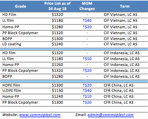 A major Saudi Arabia producer announced fresh offers for PP and PE to major Asia market at the stable to firmer level, which is in line with the initial plan. Following table detailed out the price list and month-on-month changes to Vietnam, Indonesia and China market.