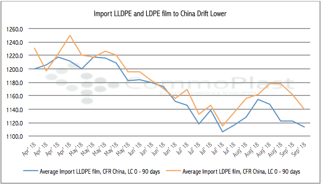 Import LLDPE film and LDPE film to China drift lower this week as demand for import cargoes weakened under the pressure of the currency exchange and fear of escalated trade war between China and the USA.