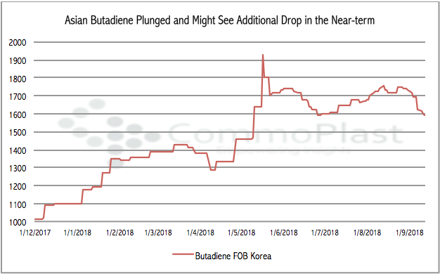 The Asian butadiene market has just plunged to the lowest level in twelve weeks no thanks to the improved supply condition and weakening downstream demand condition. As of 12 September 2018, spot butadiene based on FOB South Korea term stood at $1590/ton, down $160/ton from the cyclical peak during mid-late August.