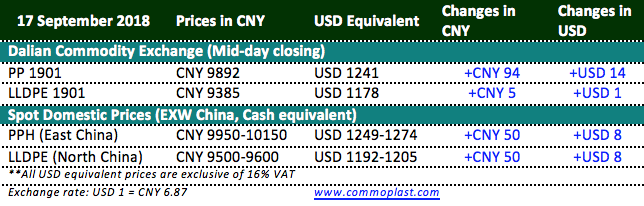 Sentiment in the local market is not strong as part of the Southern area is paralyzed following the super typhoon Mangkhut. Major roads are obstructed by fallen tree and debris and inter-city transportations remain shut. Several warehouses in the Zhusanjiao area are flooded, soaking some quantity of polyolefins pallets.