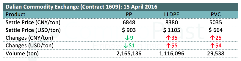 Contract number 1609 on Dalian Commodity Exchange on 15 April 2016 settled as following: