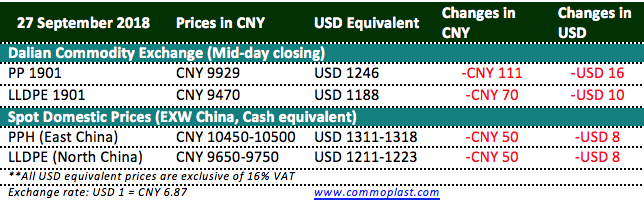 Total inventories at Sinopec and CNPC’s warehouses digested another 30,000 tons from the previous trading day to 680,000 tons as on 26 September 2018. (Correction: Total inventories on 25 September 2018 was 710,000 tons).