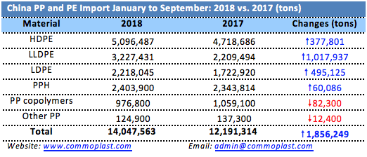 China registered 15.2% hike or more than 1.85 million tons in the total PP and PE import arrival for the period January to September 2018 compared to the same duration last year. The absence of recycled materials resulted from the ban on plastics scrap import played a major role in such development.