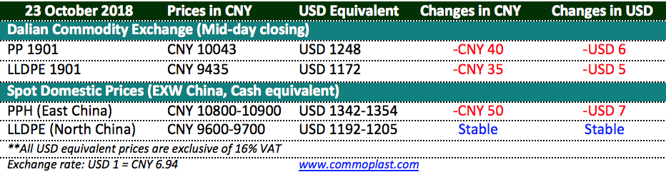 Total inventories at Sinopec and CNPC’s warehouses dropped 35,000 tons from the previous trading day to 810,000 tons as on 23 October 2018.