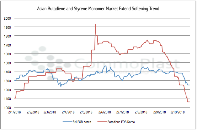 In fact, butadiene based on FOB Korea term has shredded $190/ton since the beginning of October and when compared to the last peak during late August, the market has lost $690/ton to $1060/ton as on 22 October 2018. Meanwhile, styrene monomer (SM) based on FOB South Korea has also plunged approximately $130/ton compared to the beginning of October.
