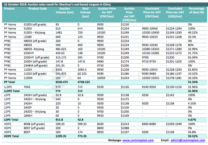 31 October 2018: Auction sales result for Shenhua's coal-based cargoes in China