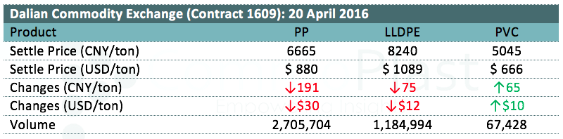 Contract number 1609 on Dalian Commodity Exchange on 20 April 2016 settled as following:
