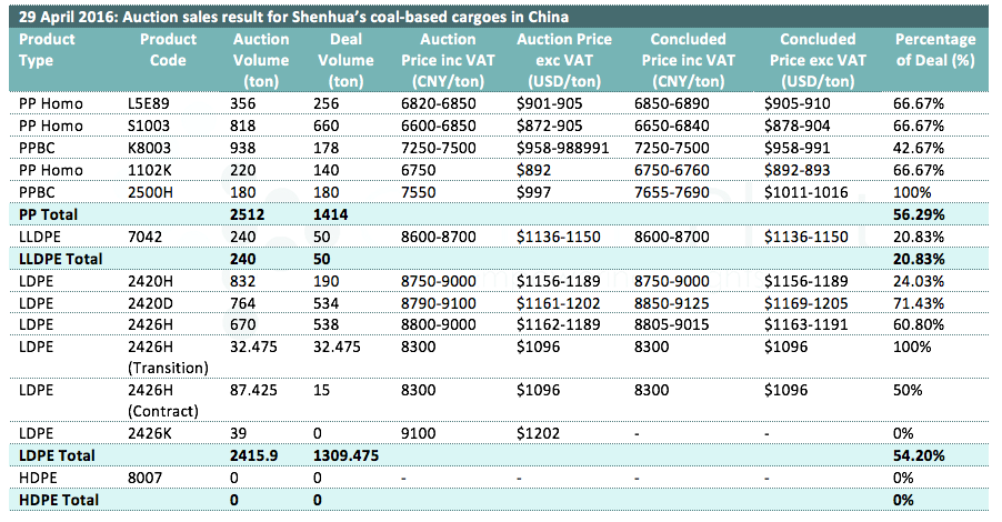 Auctions sales result for Shenhua’s coal-based polyolefin products in domestic China are as following: