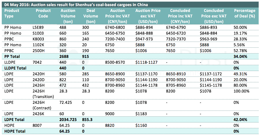 04 May2016: Auction sales result for Shenhua's coal-based cargoes in China