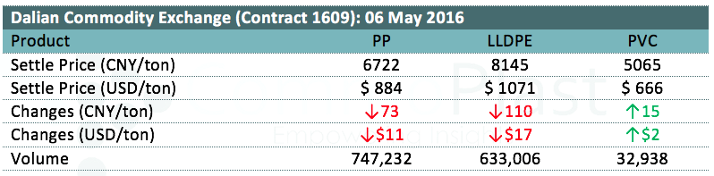 Contract number 1609 on Dalian Commodity Exchange on 06 May 2016 settled as following: