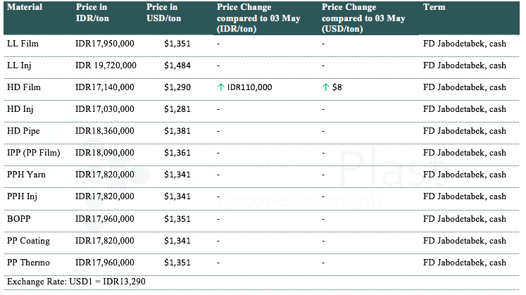A major maker in Indonesia has increased their offers by beginning of the week for HDPE film with price hike of IDR110,000/t ($8/t) while maintaining offers for other grades stable as compared to last week.