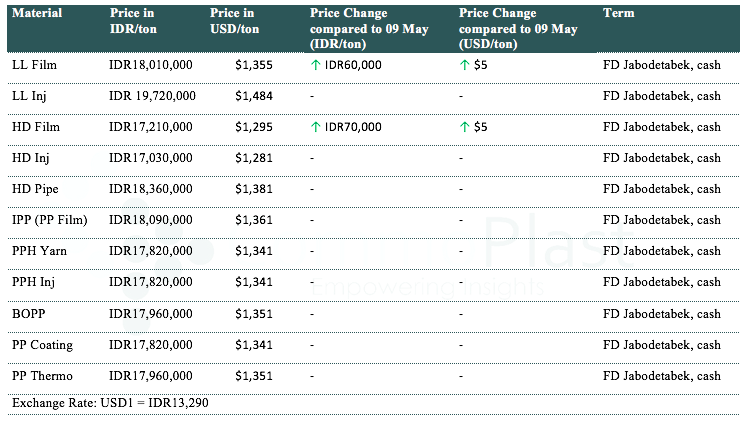 A major maker in Indonesia has adjusted their offers for the second time this week whereby the prices for LLDPE film and HDPE film has increased IDR60000/t ($5/t) and IDR70000/t ($5/t) compared to yesterday.