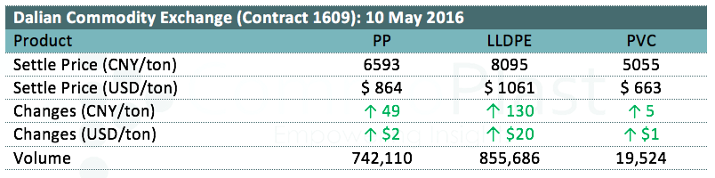 Contract number 1609 on Dalian Commodity Exchange on 10 May 2016 settled as following:
