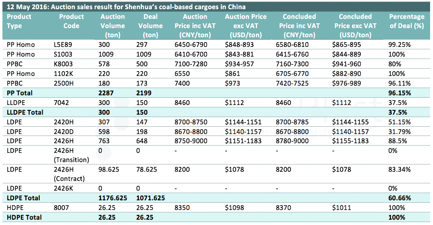 12 May 2016: Auction sales result for Shenhua's coal-based cargoes in China