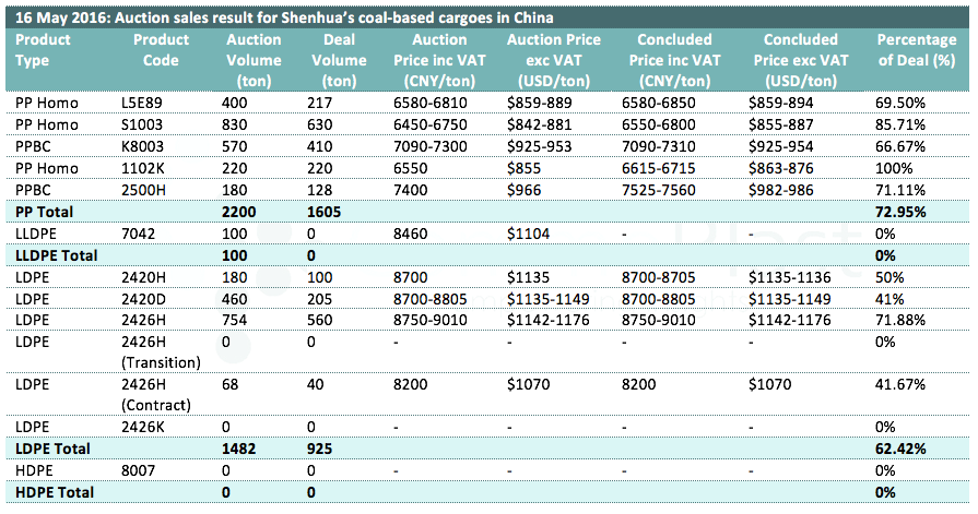 16 May 2016: Auction sales result for Shenhua's coal-based cargoes in China