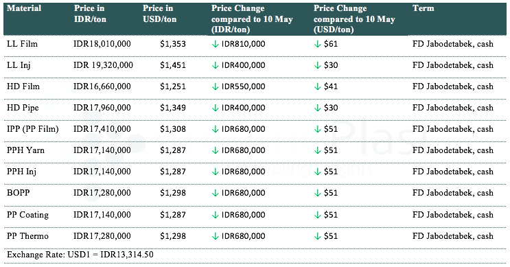 A major maker in Indonesia has announced their new offers for beginning of the week with reduction of IDR400,000-810,000/t ($30-61/t) for LLDPE, IDR400,000-550,000/t ($30-41/t) for HDPE and IDR680,000/t ($51/t) for PP compared to last week.