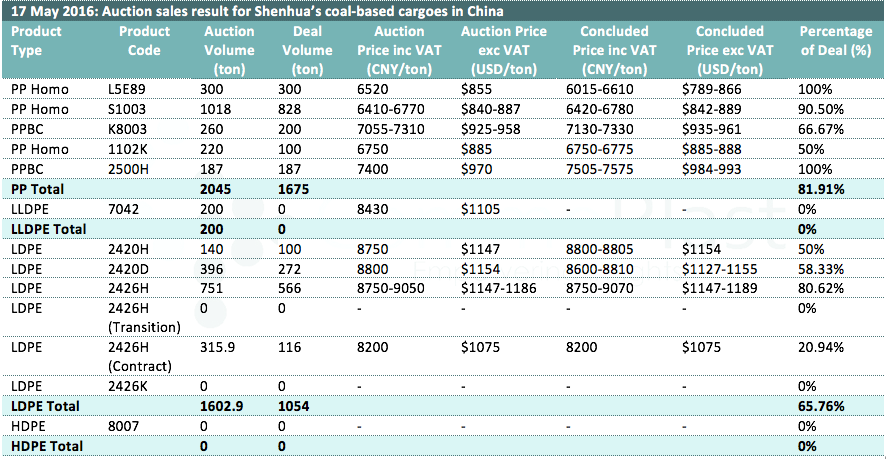 17 May 2016: Auction sales result for Shenhua's coal-based cargoes in China