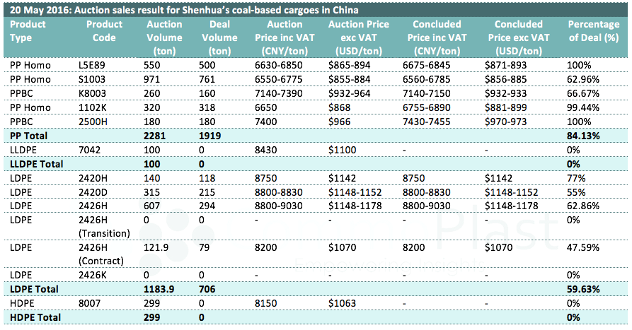 20 May 2016: Auction sales result for Shenhua's coal-based cargoes in China