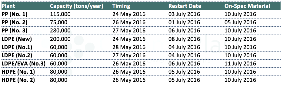 Market sources reported that Sinopec Beijing Yanshan Petrochemical Co Ltd is planning to bring on-stream for its PP and PE units from previous turnaround by beginning of July. Based in Beijing China, the details of the restart schedule and date of the production for on-spec cargoes from the related units are shown as following: