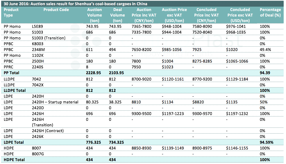 Auctions sales result for Shenhua’s coal-based polyolefin products in domestic China are as following: