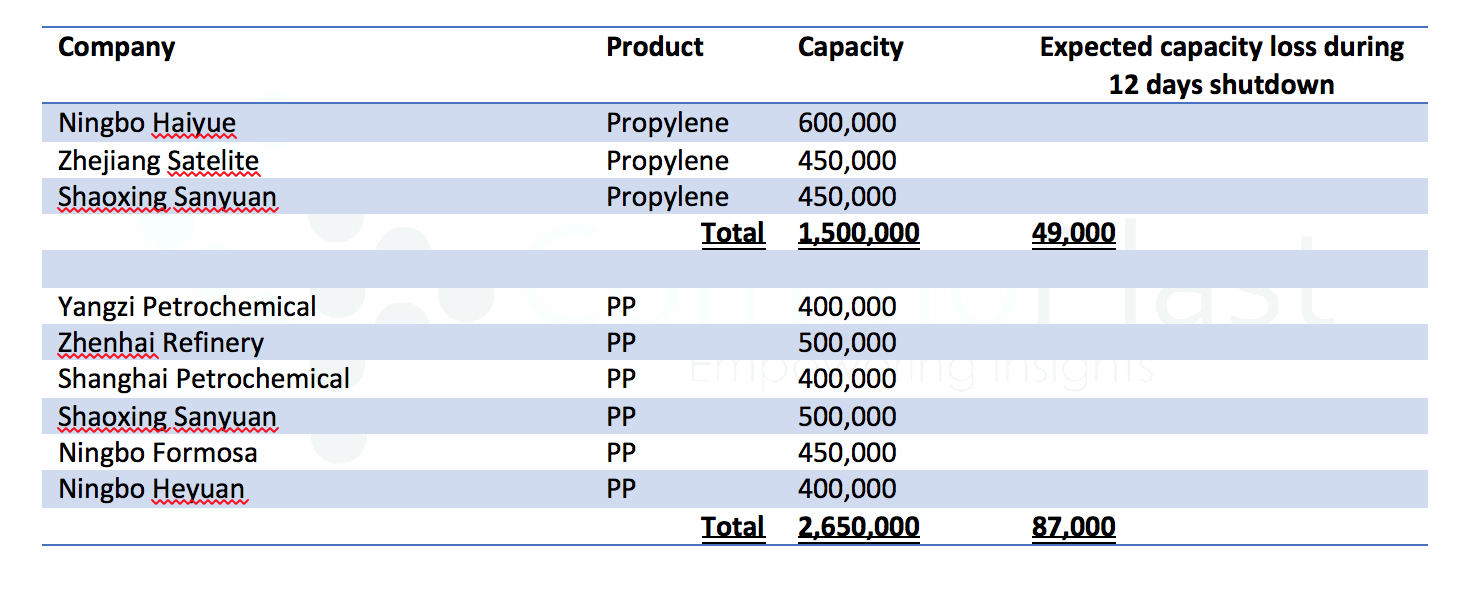 Market participants are expecting at least six PP plants around Hangzhou area to be shut during the summit, which are listed in the following table. As a result, a major question now is would PP supply tighten?