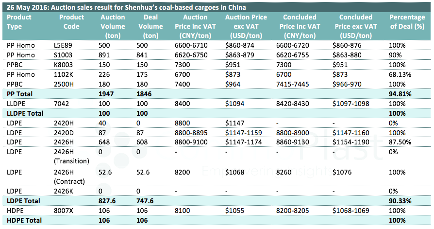Auctions sales result for Shenhua's coal-based polyolefin products in domestic China are as following: