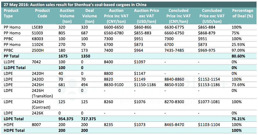 Auctions sales result for Shenhua’s coal-based polyolefin products in domestic China are as following: