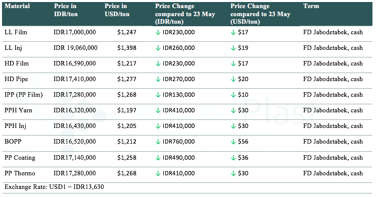 A major maker in Indonesia has announced their new offers for beginning of the week with reduction of IDR230,000-260,000/t ($17-19/t) for LLDPE, IDR230,000-270,000/t ($17-20/t) for HDPE and IDR130,000-760,000/t ($10-56/t) for PP compared to their offers last week.
